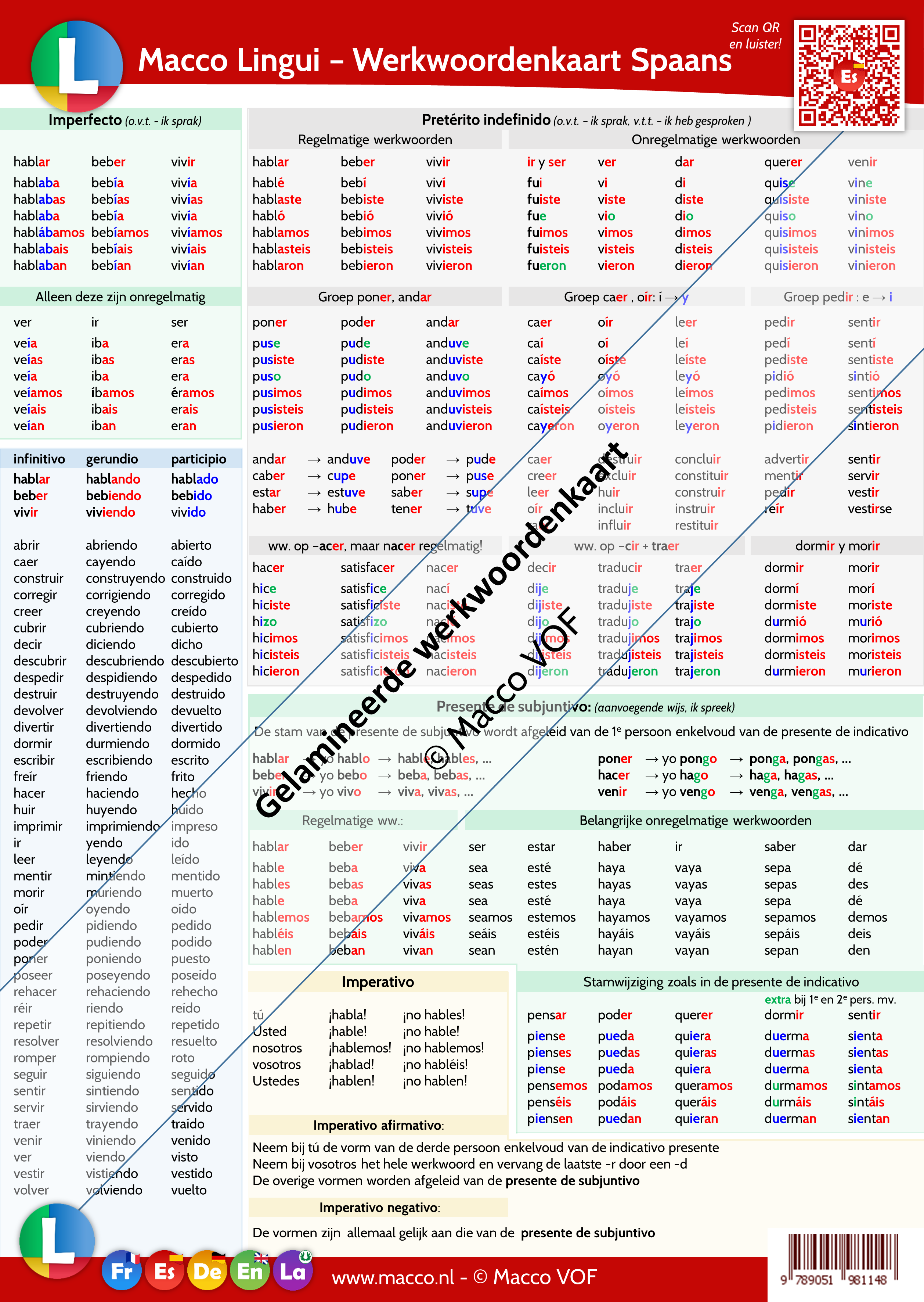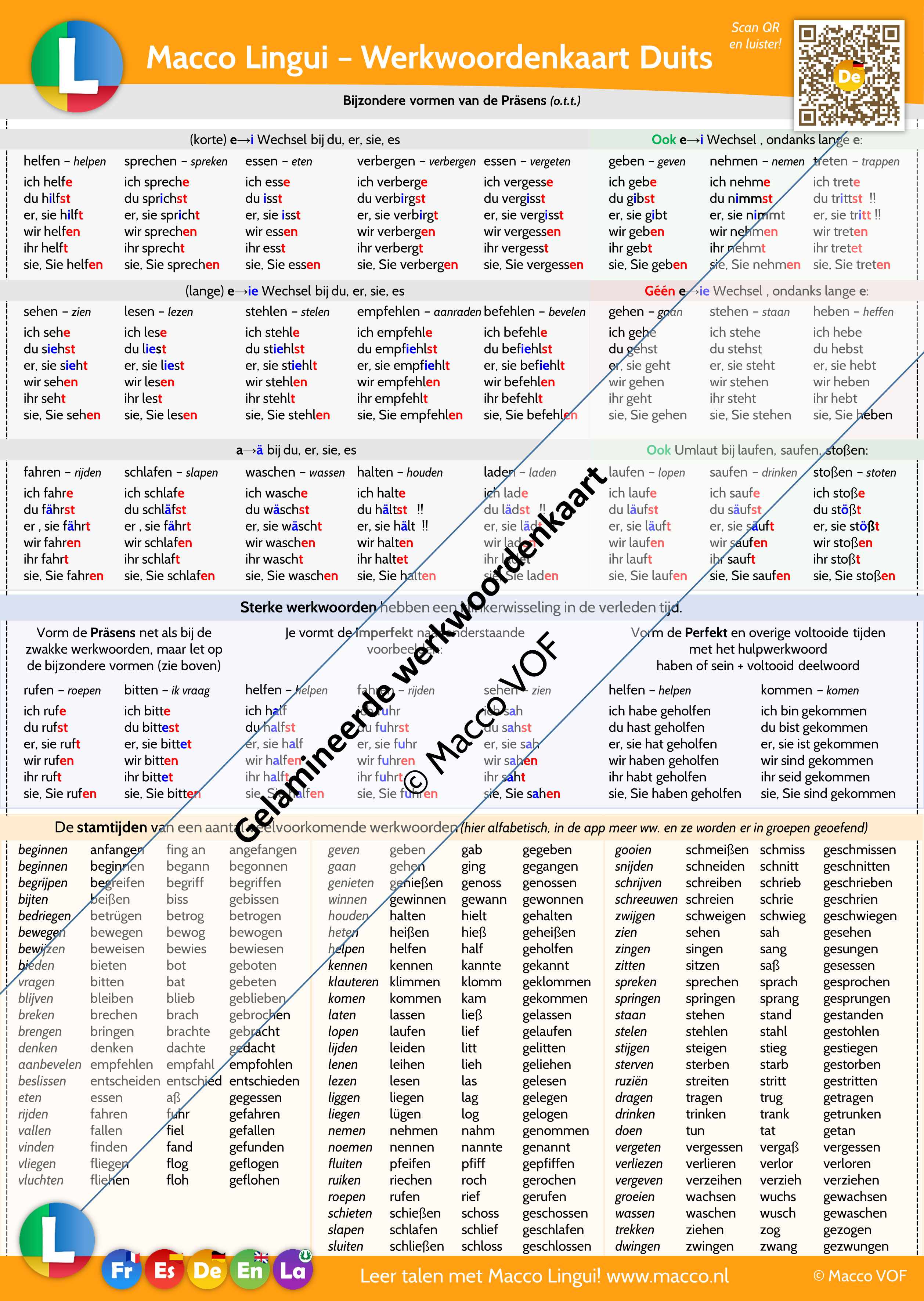 Bijvoorbeeld: nous finissons. Deze kleuren komen overeen met onze app Macco Lingui. - Met behulp van een QR code kan de leerling alle vervoegingen en voorbeelden beluisteren! Zie hier een voorbeeld van de luisterpagina van de werkwoordenkaart Frans.