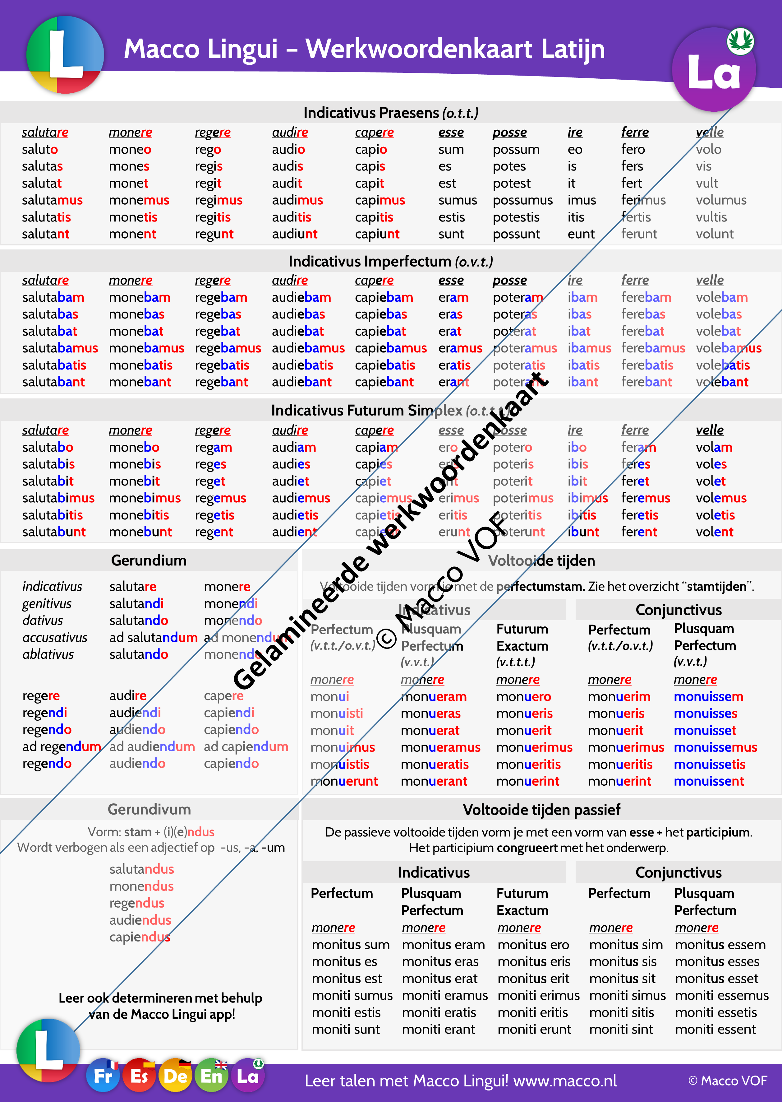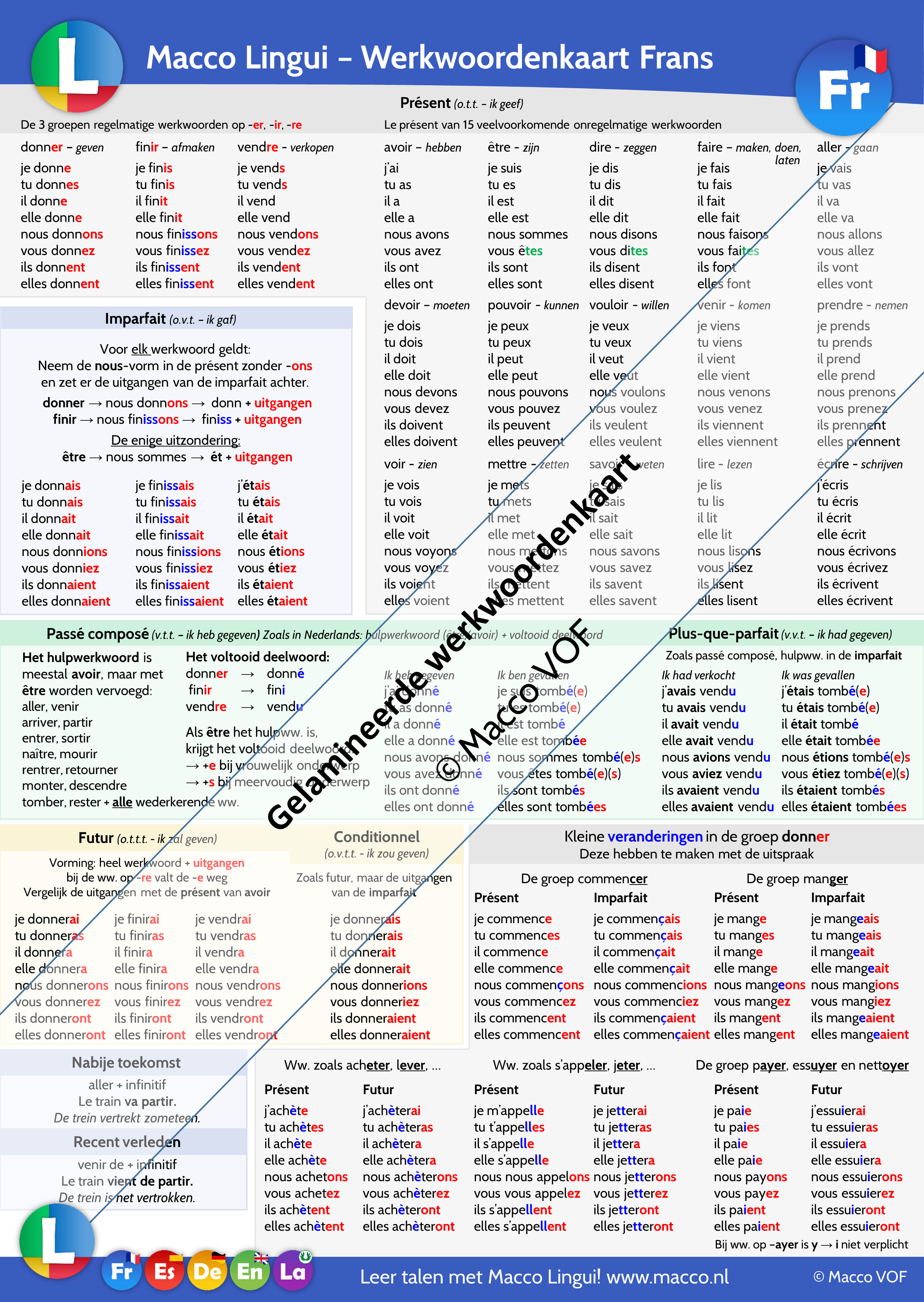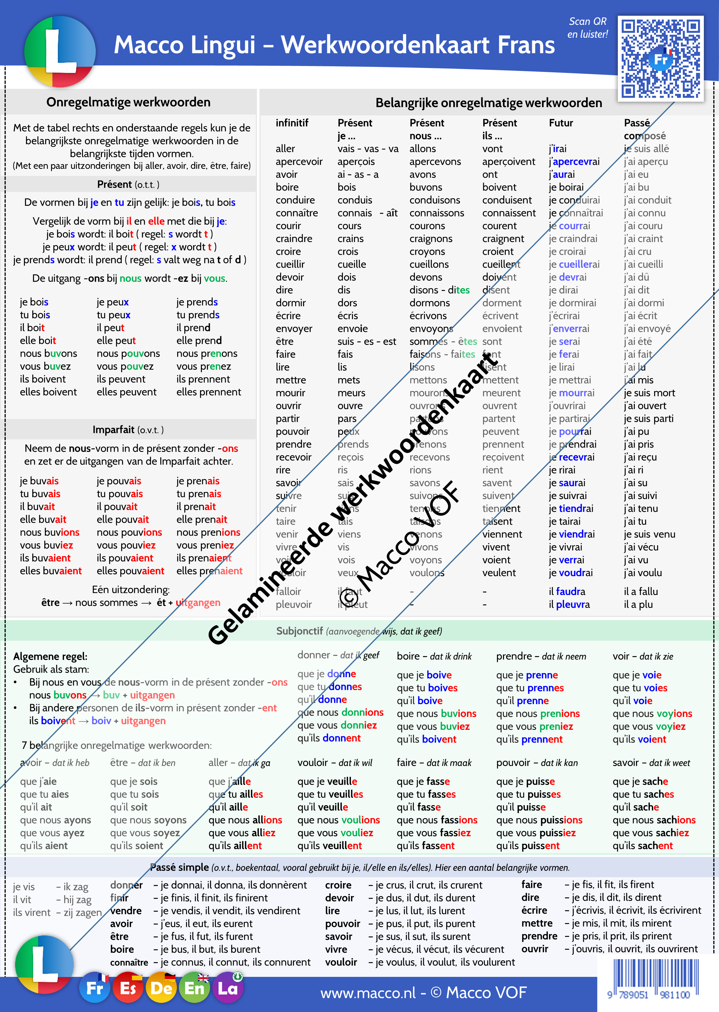 Bijvoorbeeld: nous finissons. Deze kleuren komen overeen met onze app Macco Lingui. - Met behulp van een QR code kan de leerling alle vervoegingen en voorbeelden beluisteren! Zie here een voorbeeld van de luisterpagina van de werkwoordenkaart Frans.