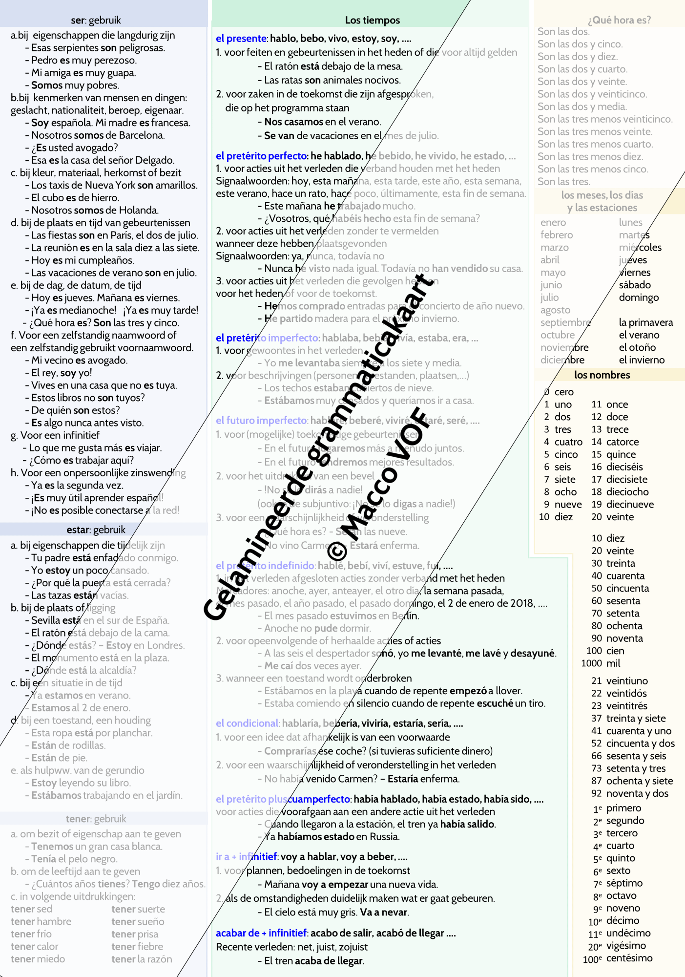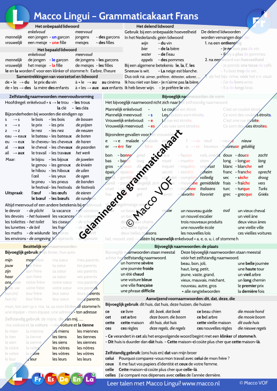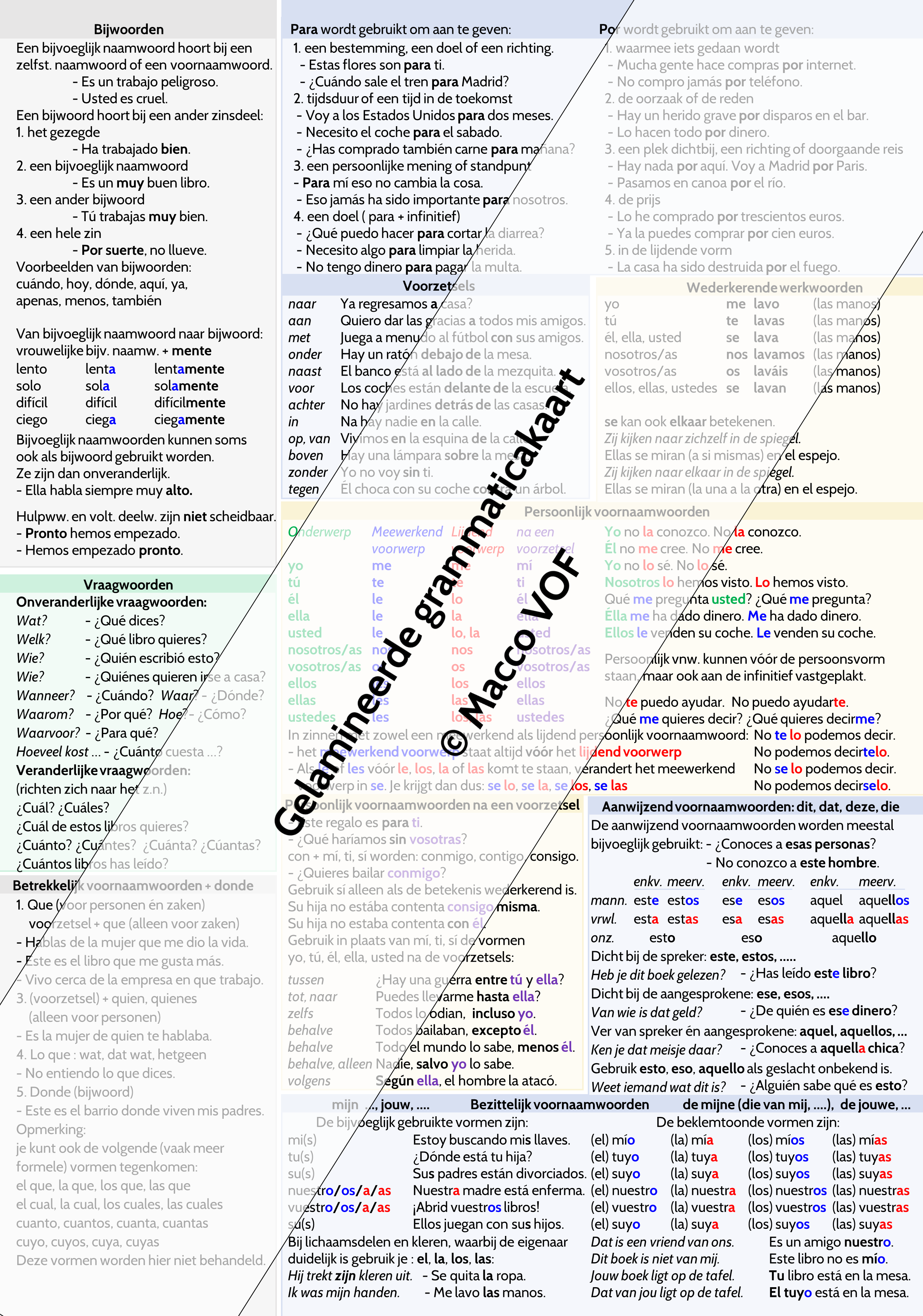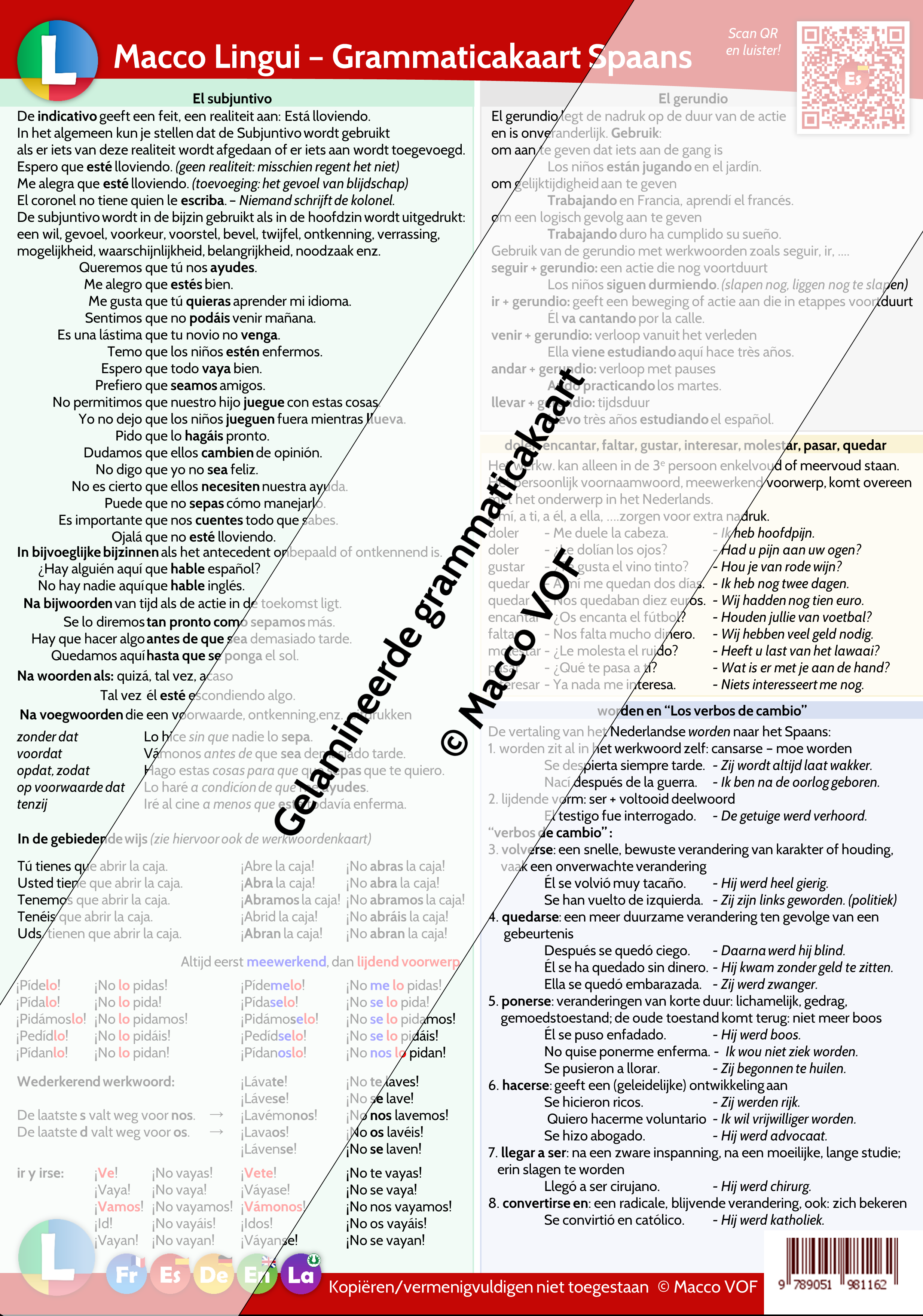 The inkijkexemplaren onderaan deze pagina geven alvast een voorproefje! Gedetailleerdere informatie treft u aan op de pagina’s French grammar card and Spanish grammar card.