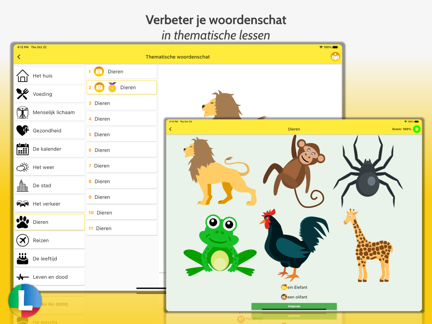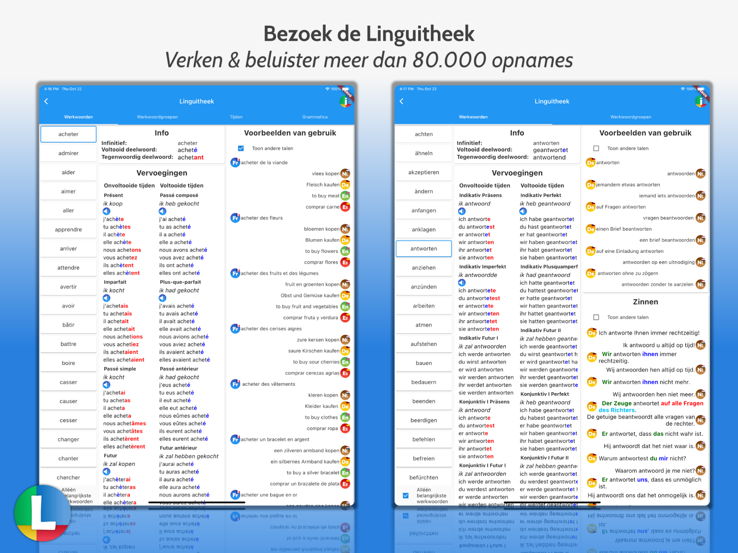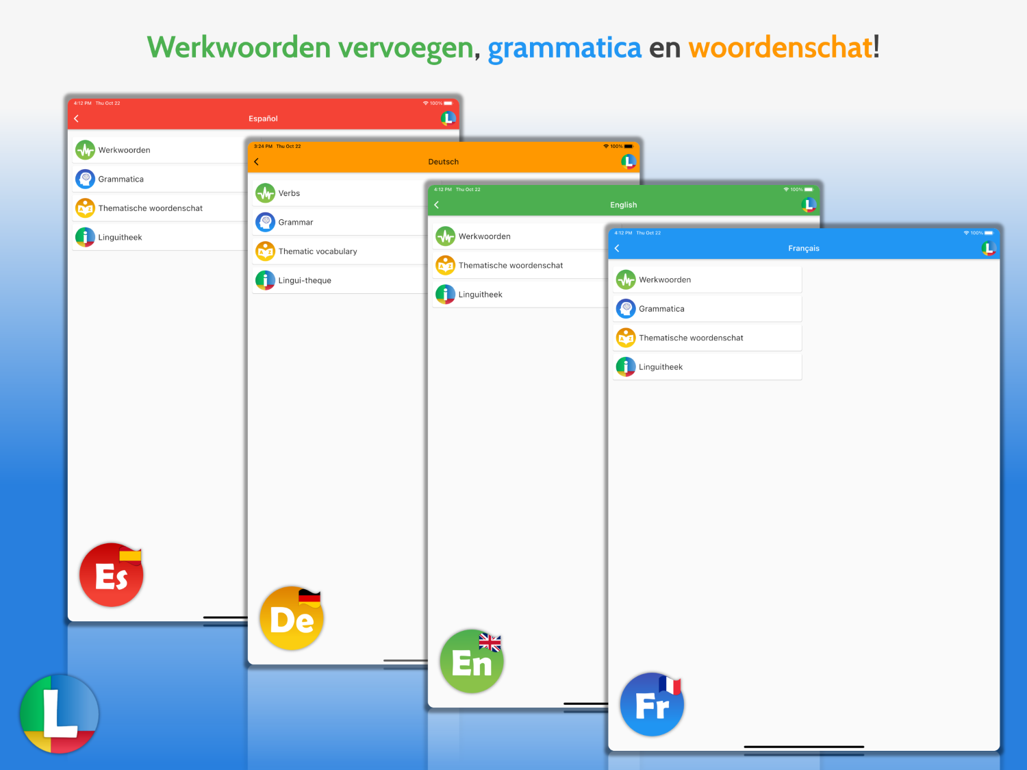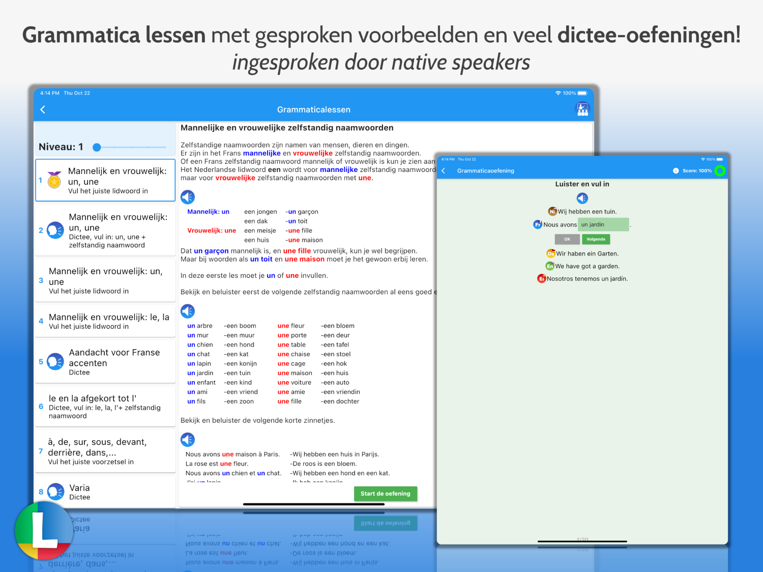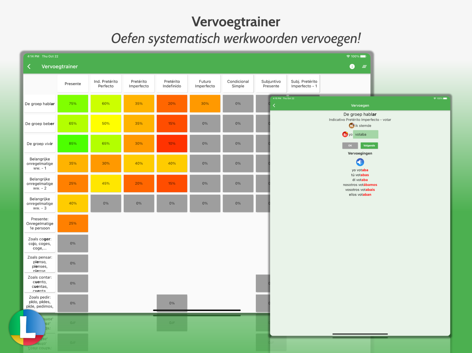 • Een groot aantal lessen over de werkwoordsvervoegingen, grammatica en woordkennis